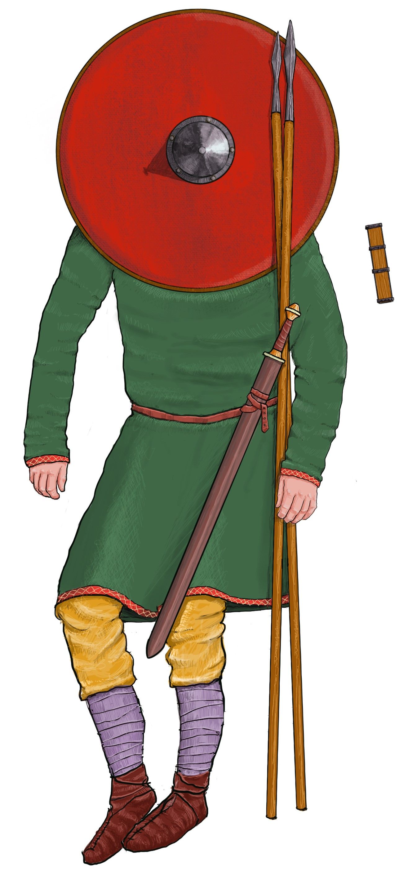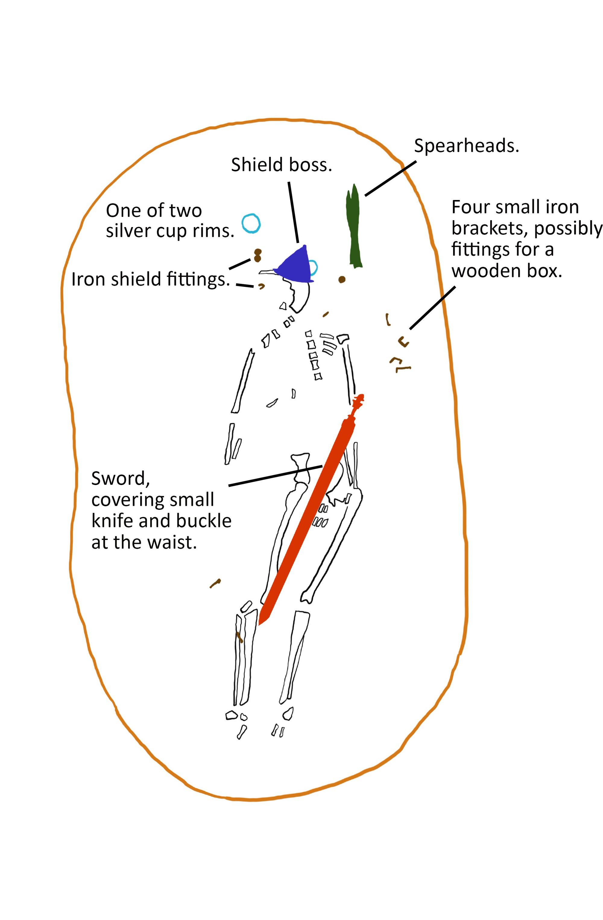 The burial was of a young man, aged around 28. Due to the chemical reaction of the soil on the bones the skeleton was incomplete. An iron shield boss on top of the skull indicates a shield covered the top half of the body, masking the face.