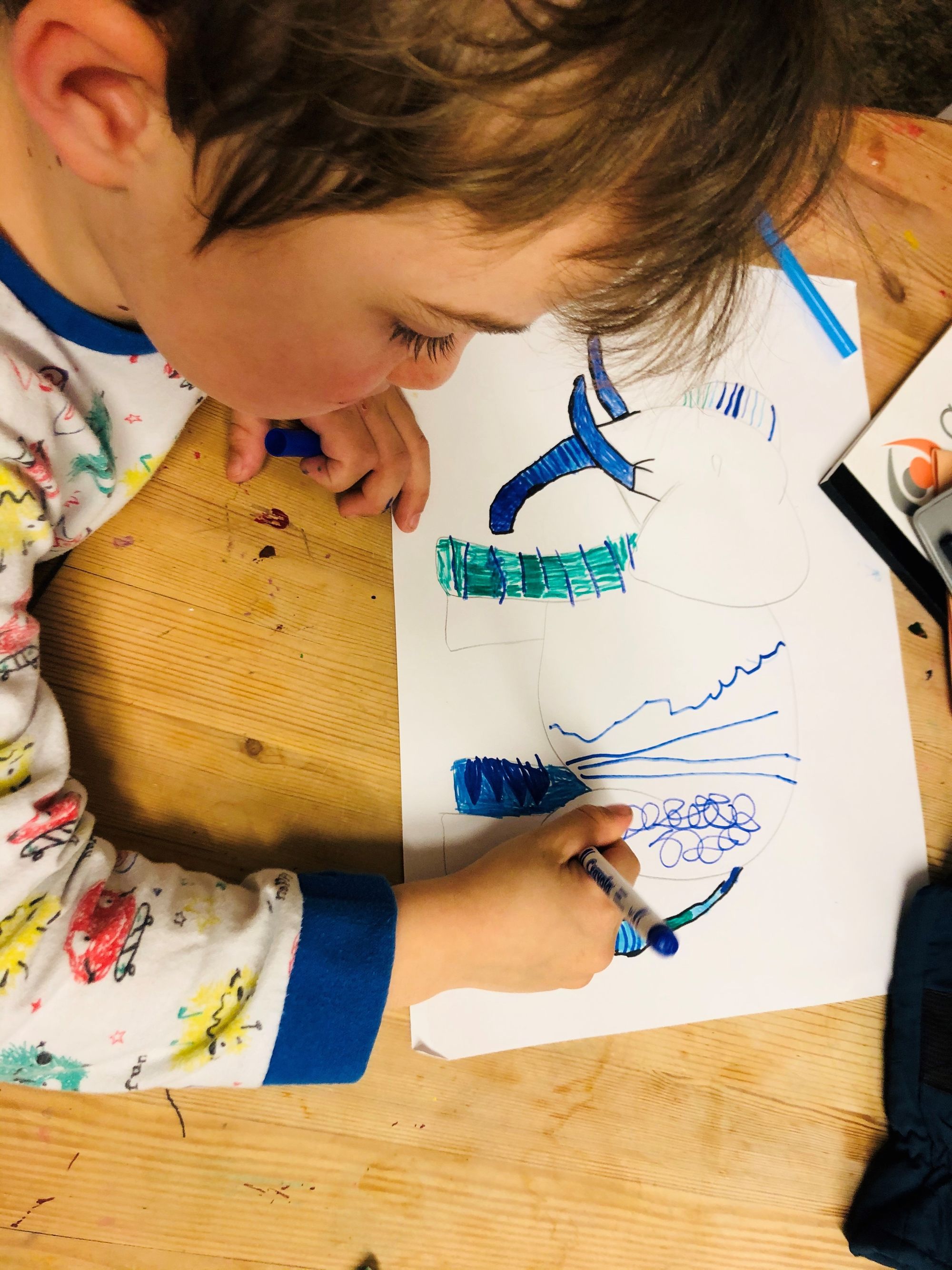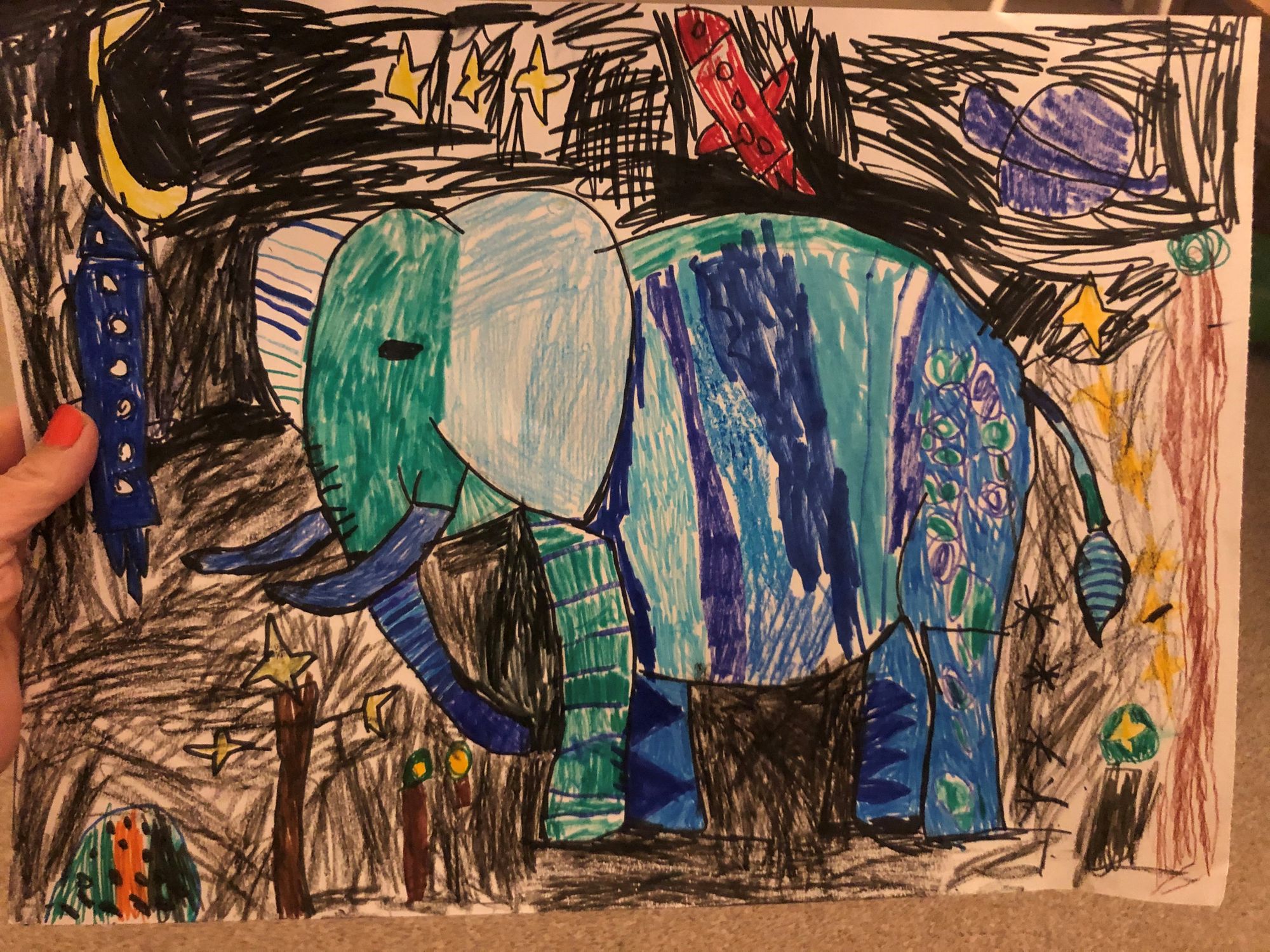 Draw a big, we mean a REALLY BIG elephant and colour it in with different shades and patterns of blue…then put your elephant on a space themed background!