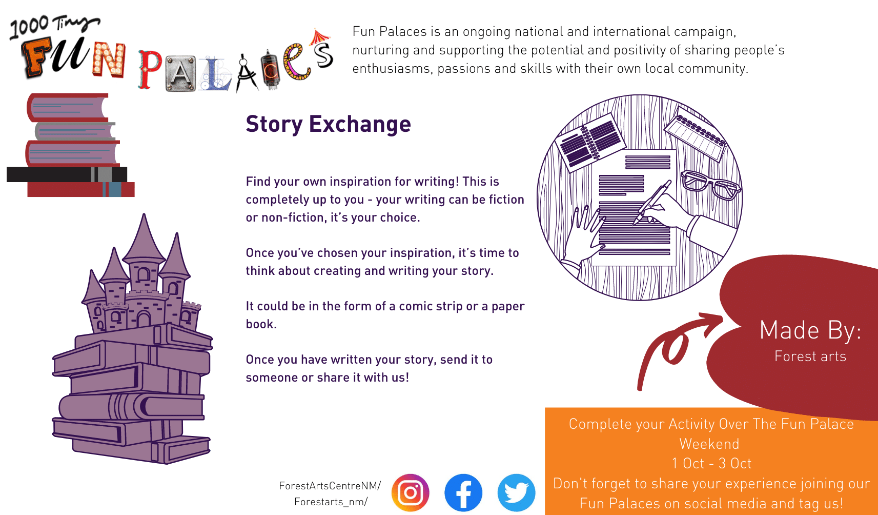 From 1 - 3 October, take part in this year's national Fun Palaces weekend with us online at Forest Arts Centre, by completing activities on the virtual postcards below - once you have finished your activity why not print it off, add a stamp and send it onto a friend, or swap with someone else? Don't forget to share your Fun Palace experiences by tagging us on Facebook, Instagram or Twitter too!
