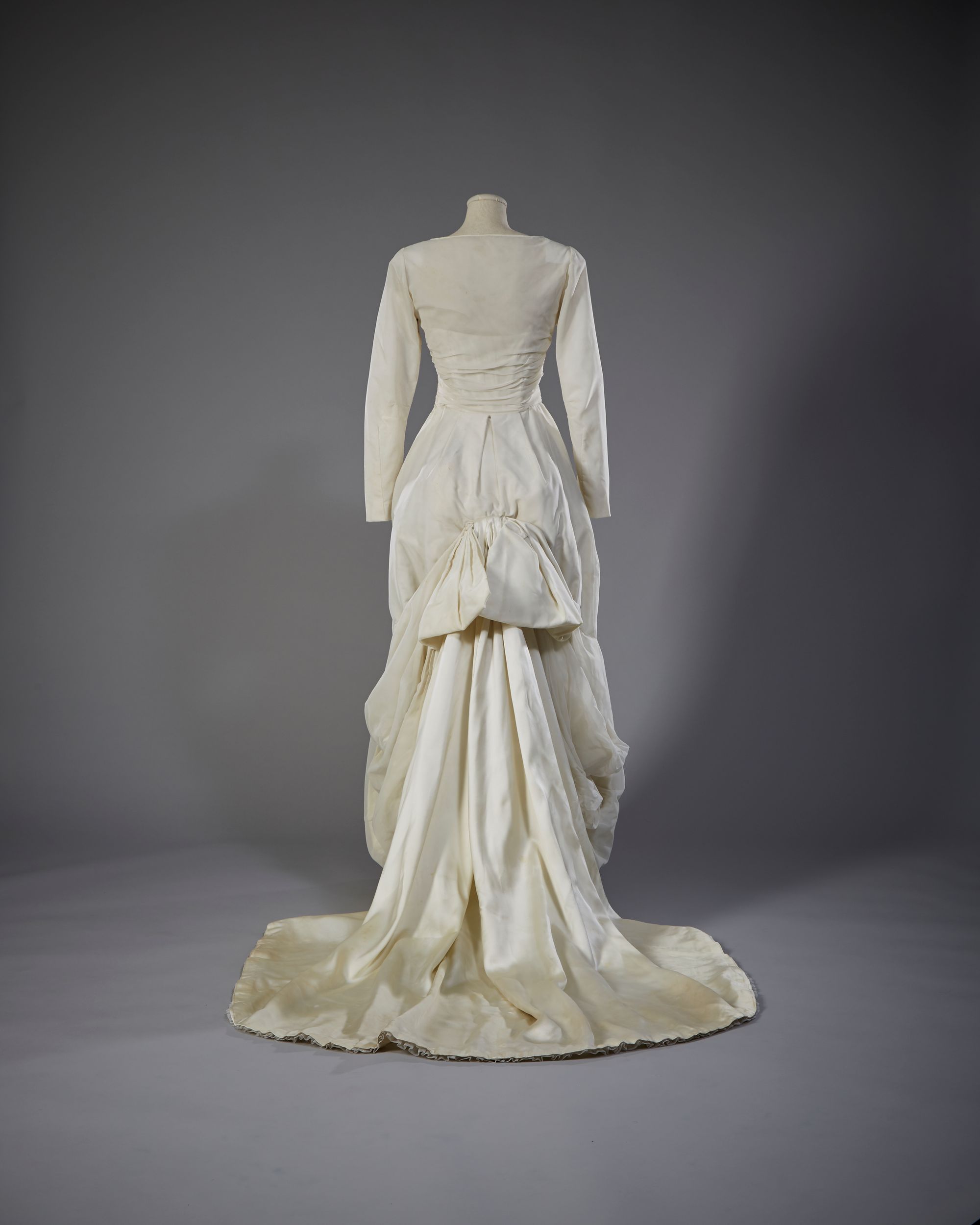In 1957, the wearer of this gown visited a couturier with her mother, excited by these new styles. A design was picked, but production in traditional silk made was unfeasible. The couturier suggested the use of a modern fabric that had recently become fashionable: nylon. This new fabric made this fashionable gown, with its tight-fitting bodice, bateau neckline and full train, look ethereal and modern.
