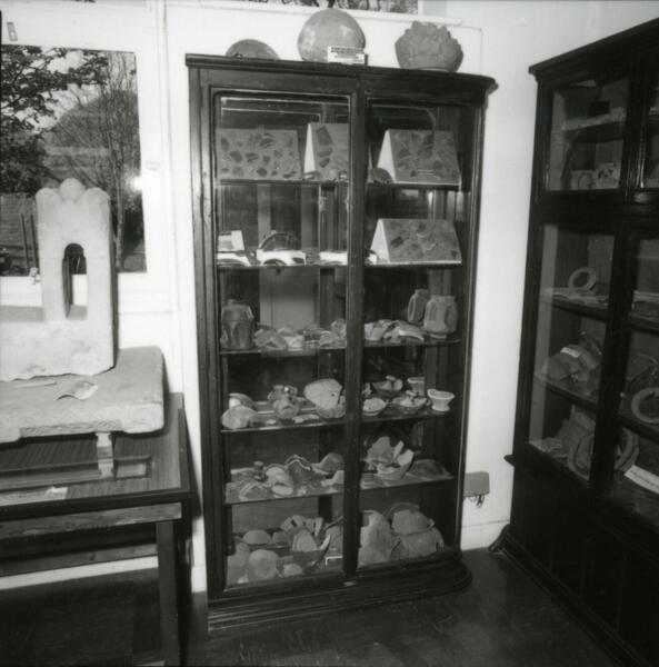 The collection team have kindly scanned these images for me to show what the museum looked like before our current displays were installed. Since the 1980s, museums have focused on making history accessible, which meant the old-style cabinet to house the objects was replaced with our current thematic displays. We use selected objects in displays to represent a theme, such as how the villa farmed the land and how it looked.