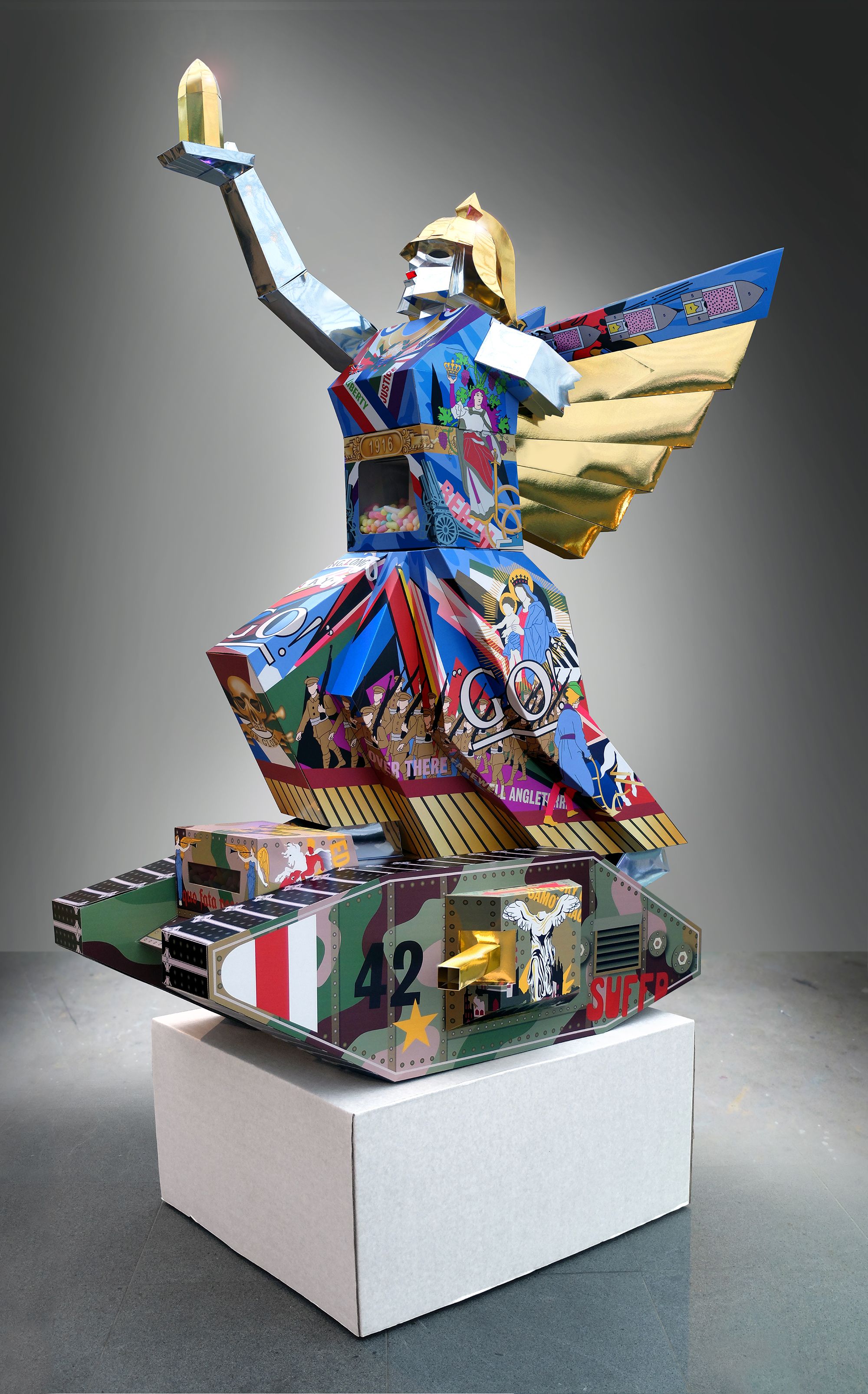 For Mythomania, Kirkpatrick has created a series of stunning 2D and sculptural works which explore humanity’s ongoing fascination with mythical stories - from ancient Greek legends to modern superheroes and 'fake news'. The large-scale sculptures allude to ancient monuments, dragons and robots, while the surface of each piece reflects our culture’s obsession with heroes, villains, utopias and apocalypses.