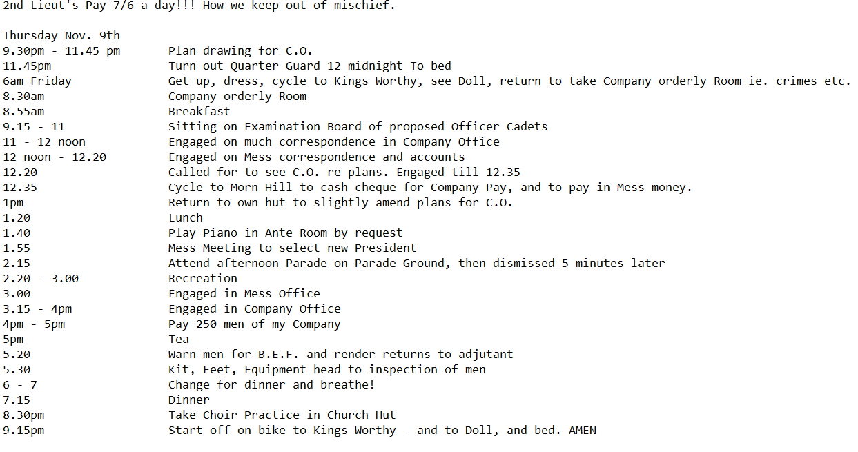 The following is an extract from a journal kept by Basil detailing a day in one of the camps, at least for an officer.