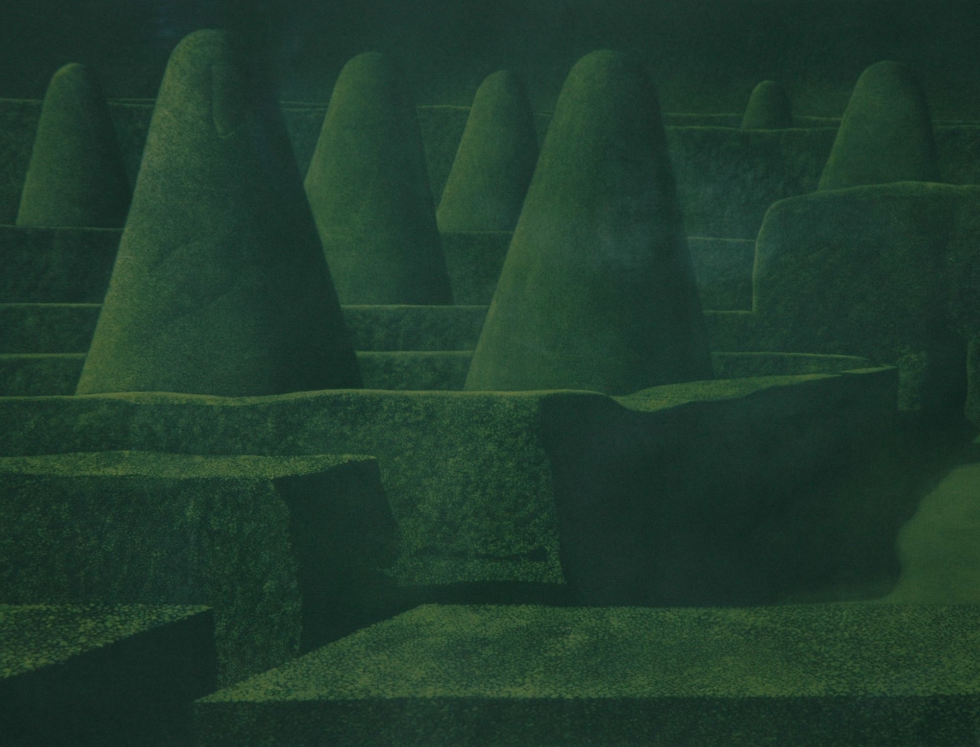 His work explores the landscape and built environment, by using colour, light and shade to a powerful and evocative effect. His early prints were poetic, deceptively simple scenes showing flowers and fronds set before clapboard houses. His later work, inspired by the English countryside and formal gardens, became more colourful and lyrical, but still was imbued with a haunting sense of stillness.