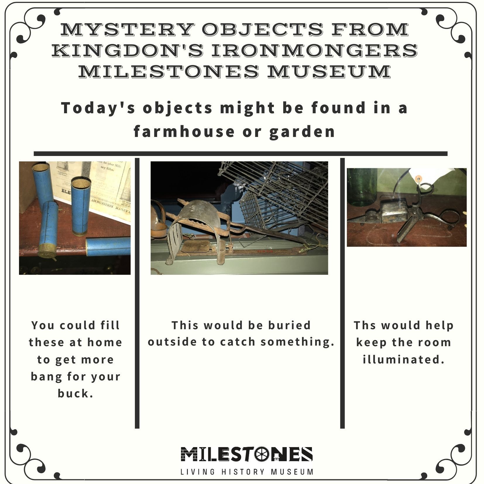 You'll find this week's objects in Kingdon's Ironmongers and they are all objects that might be found in a farmhouse or garden. Do you know what they are? What do you think they were used for? Find out the answers below!