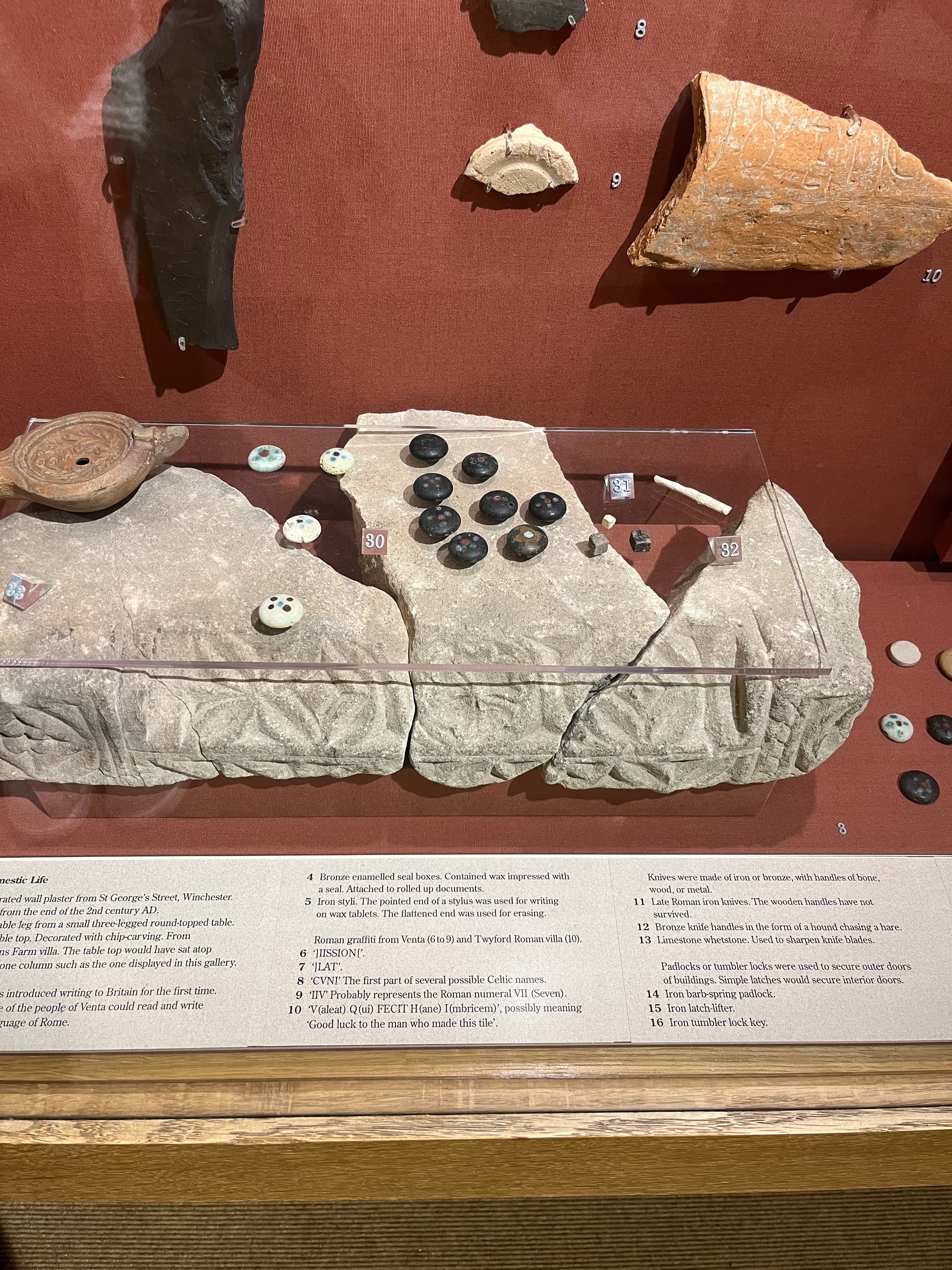 On the Roman and Iron Age floor of Winchester City Museum, we showcase day-to-day items used by those living in Roman Winchester. These include a gaming set of 26 glass counters, a bone dice and a coral stick, which were found in a grave at Lankhills Roman Cemetery.