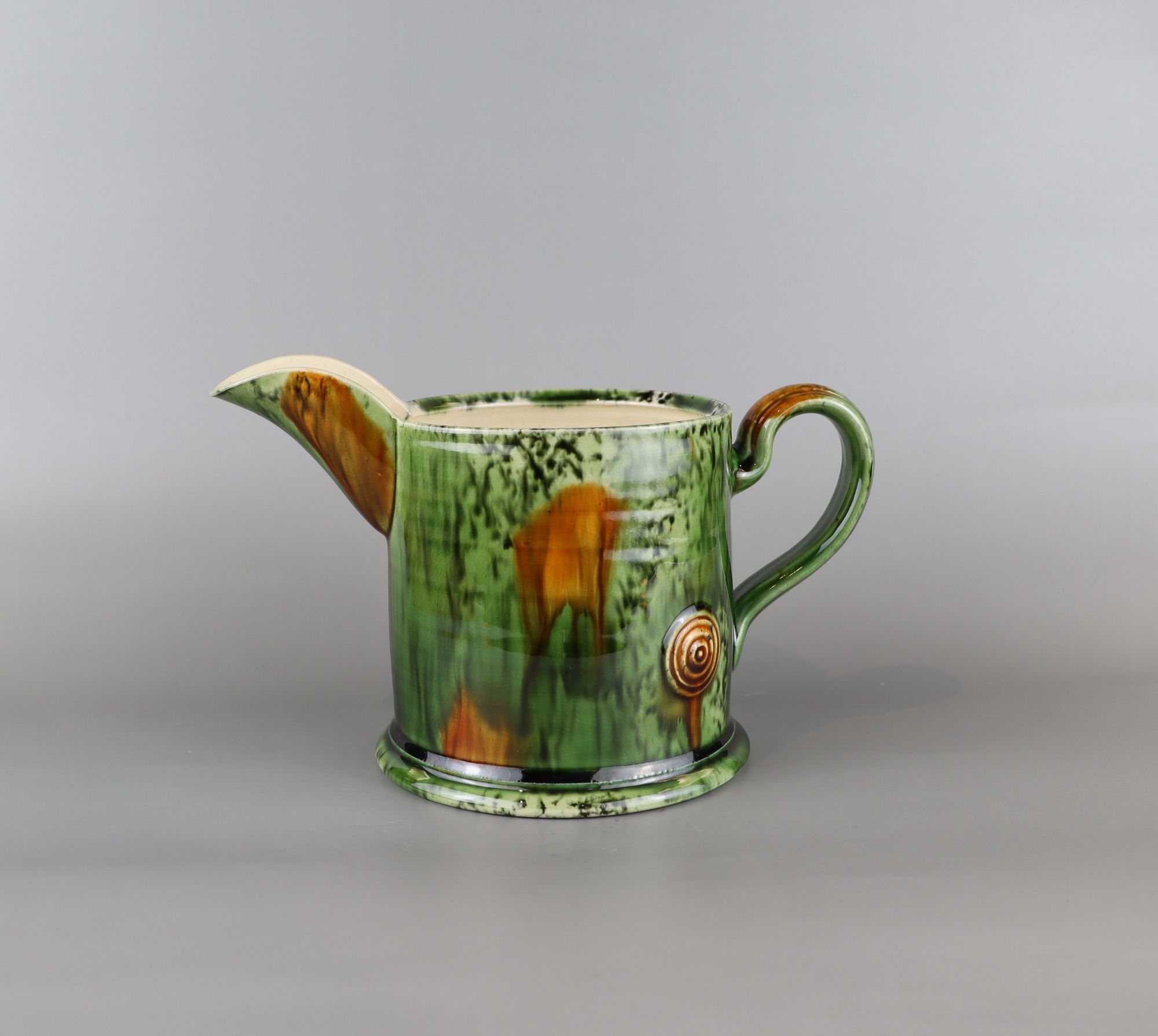 What is most striking about this jug is the mottled Whieldonware glaze which adorns it. This glaze was developed by Thomas Whieldon in the mid-18th century and involves mixing chemicals such as copper, iron and cobalt. This mixture is then sponged onto the object under the glaze with another glazed then applied on top. This leads to the beautiful melding of colours as seen in this piece by Keeler.