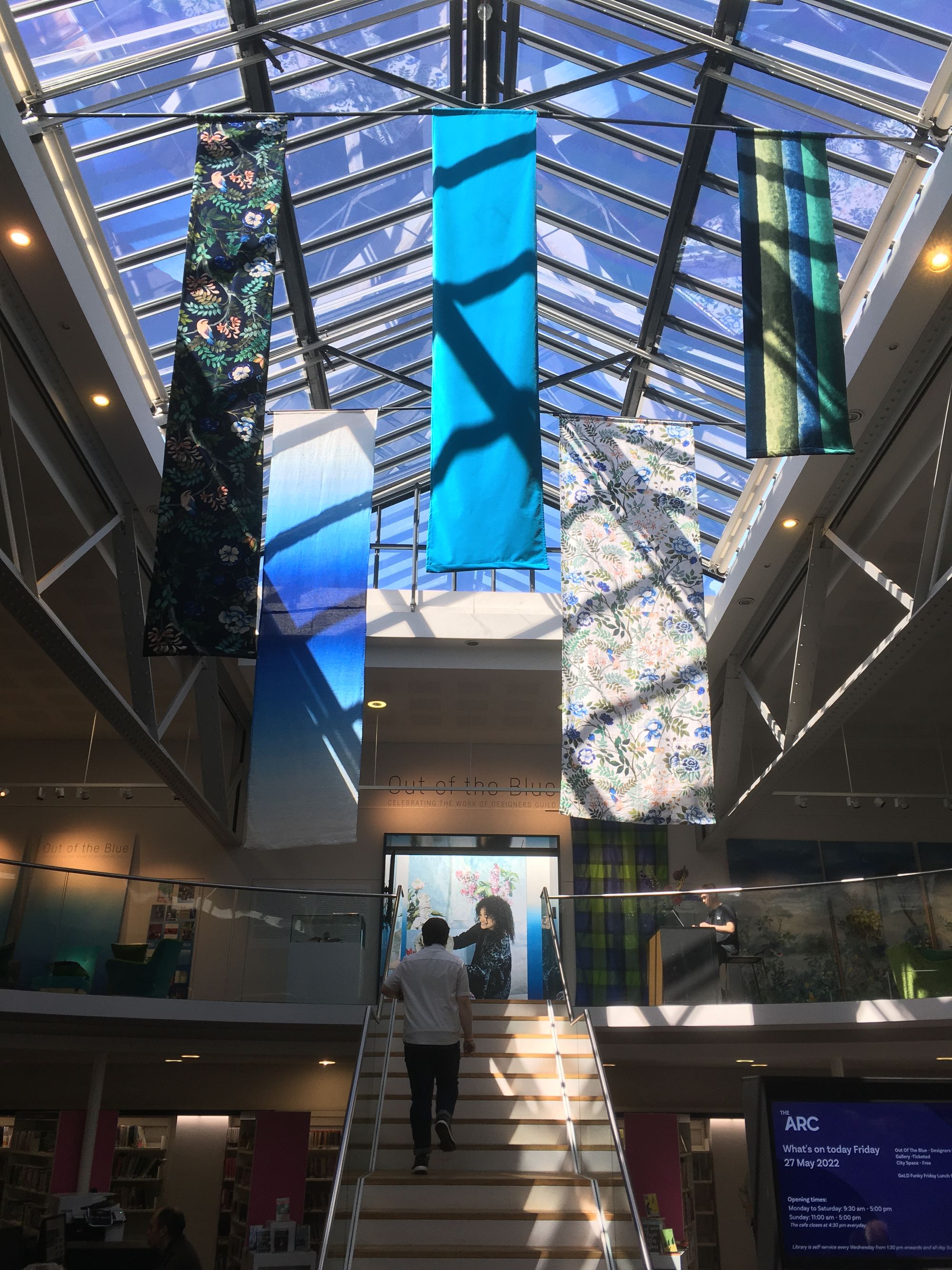 The transformation began in the atrium, with colourful banners overseeing the City Space display sets and our technician used a scissor lift to reach these heights. The City Space gallery features bespoke display sets, custom made outside of the usual touring exhibition content for Out of the Blue. The Gallery features more stunning display sets, with many wonderful items such as exquisite textiles, furniture, books, colours, and more details to discover.