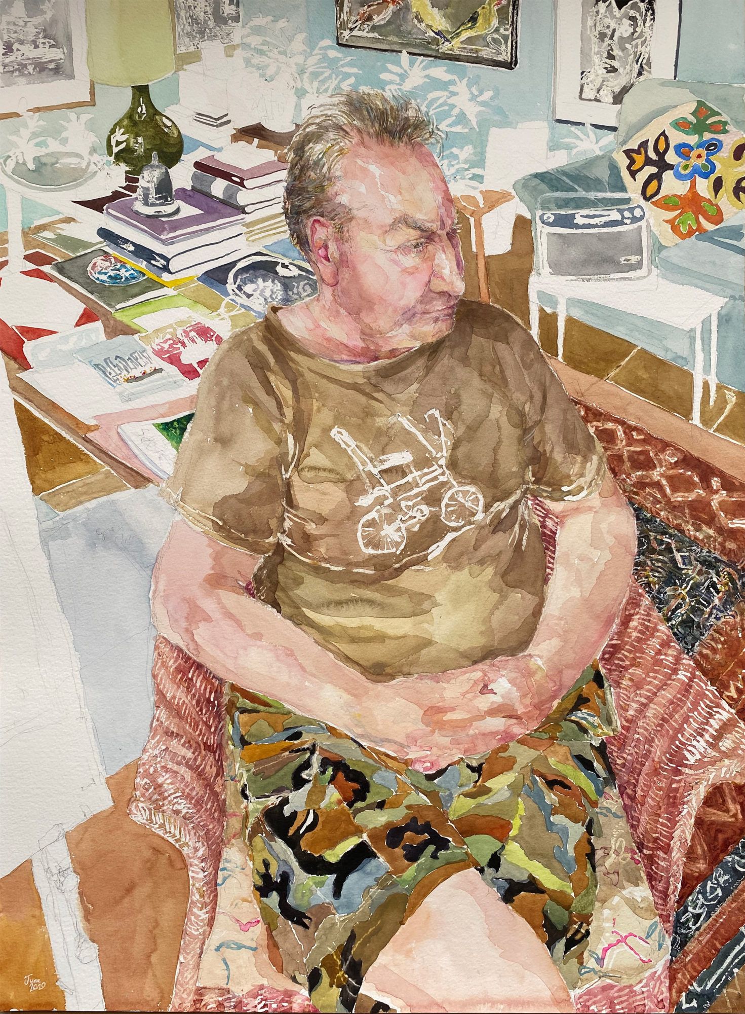Scottish portrait painter and printmaker Jennifer McRae (born 1959) took home the Third Prize for her work, West End Summer. It was remarkable for its fresh colours, tight frame and audacious use of perspective. A bird’s eye view of a London interior, this painting demonstrates the artist’s playful mastery of watercolour as a medium, mixing several patterns and textures, from the rattan chair and the carpet to the sitter’s outfit and the objects carefully accumulated in the background. “I felt the studied togetherness that many of us have had recently, locked in with the ones we love”, commented Ishbel Myerscough.