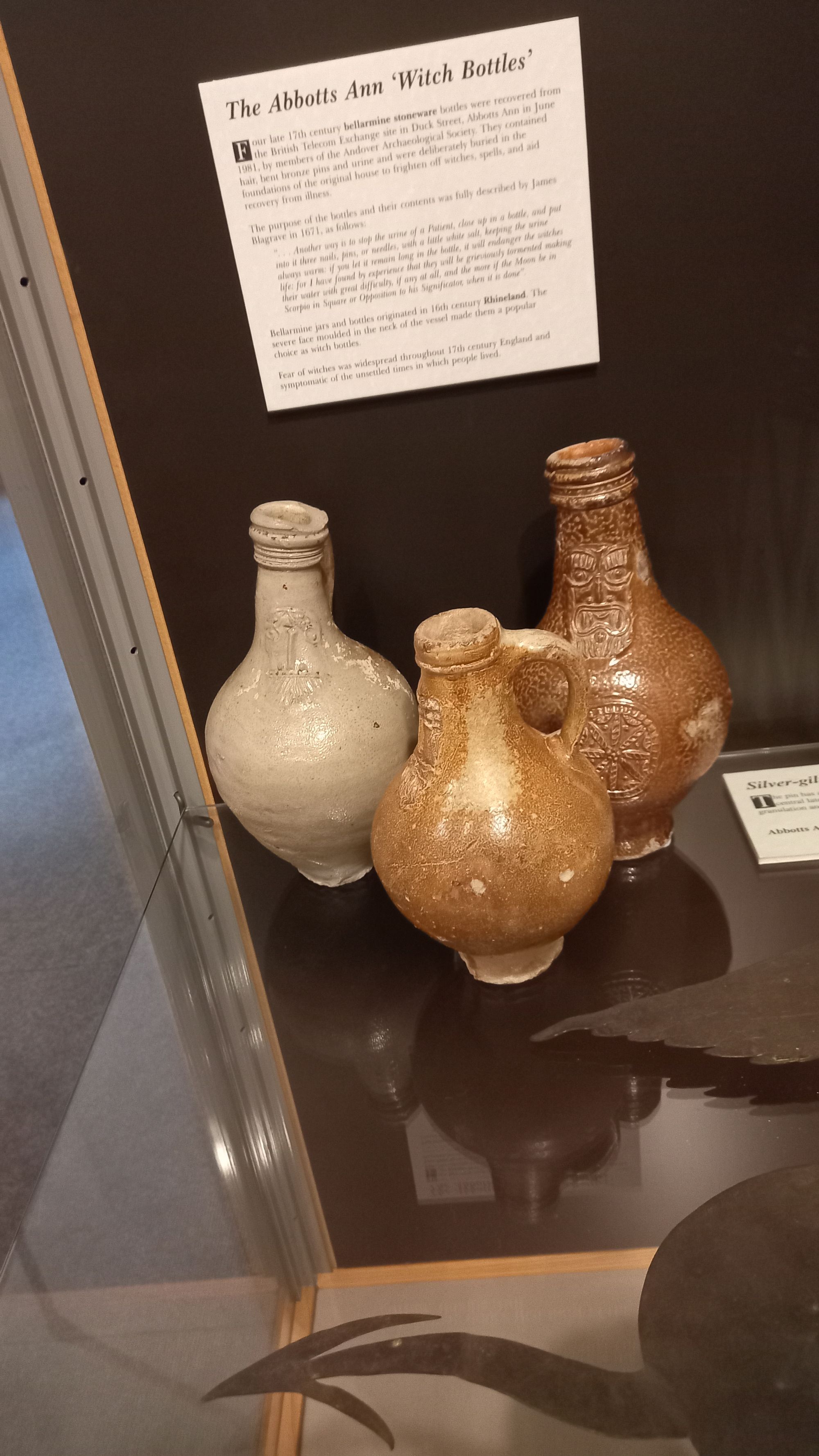 The Abbots Ann 'witch bottles' in the medieval room. I find the story of these bottles really quite fascinating as the mixing of various contents such as hair, bent bronze pins and urine into the jars and then burying the jars in the foundations of a house to ward off witches and effectively cause them harm... something that sounds a lot like witchcraft itself to me!