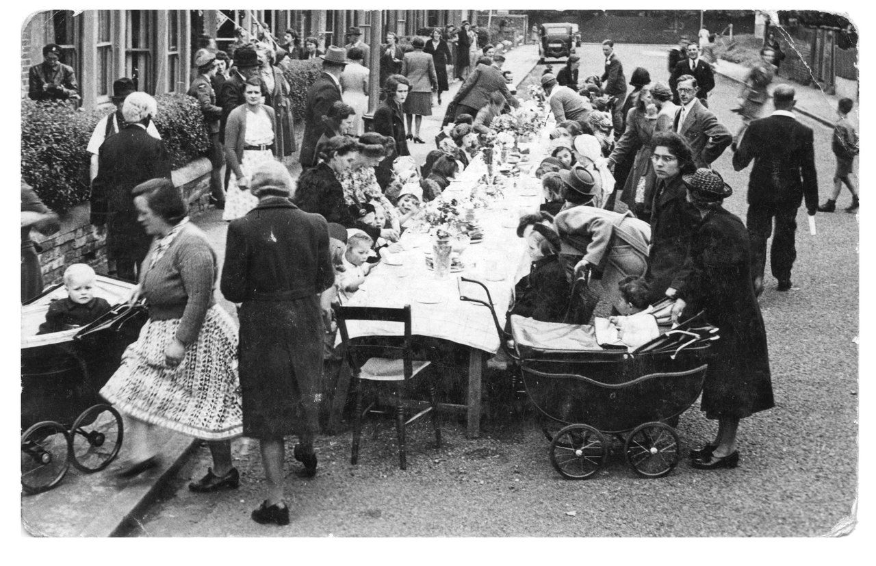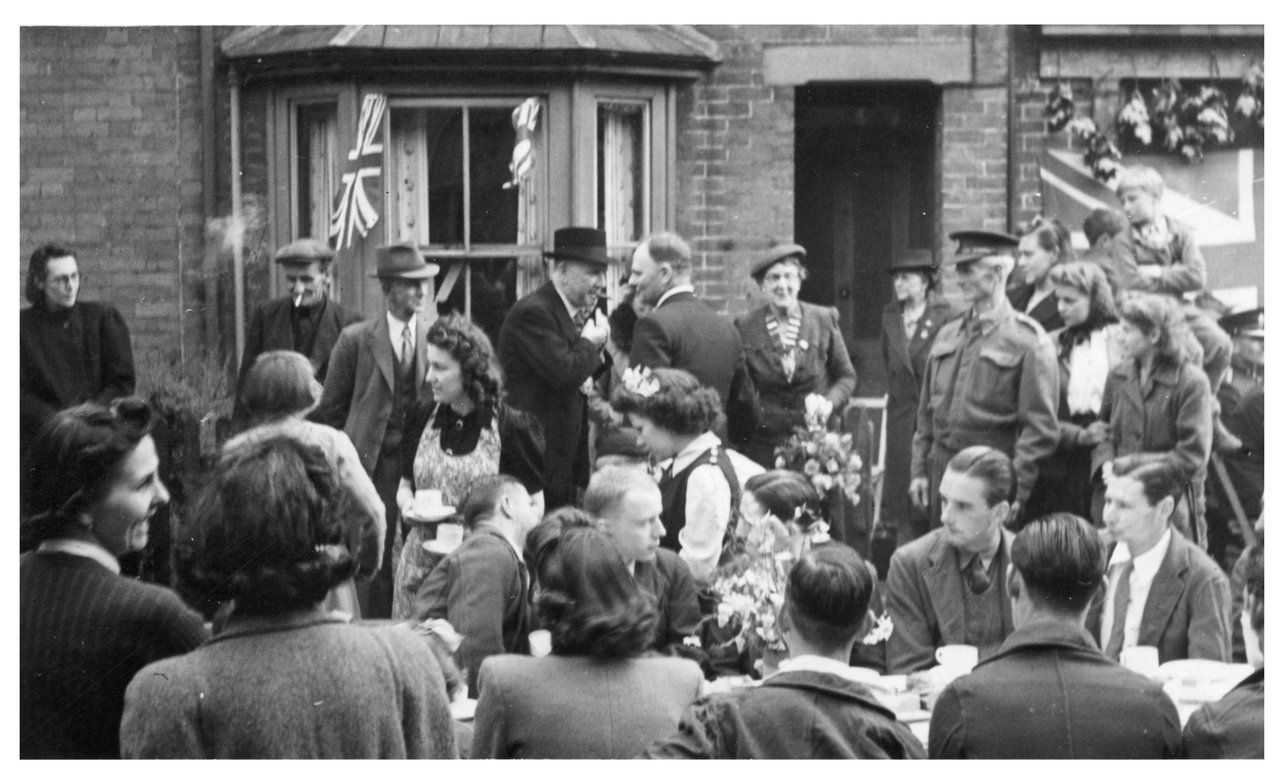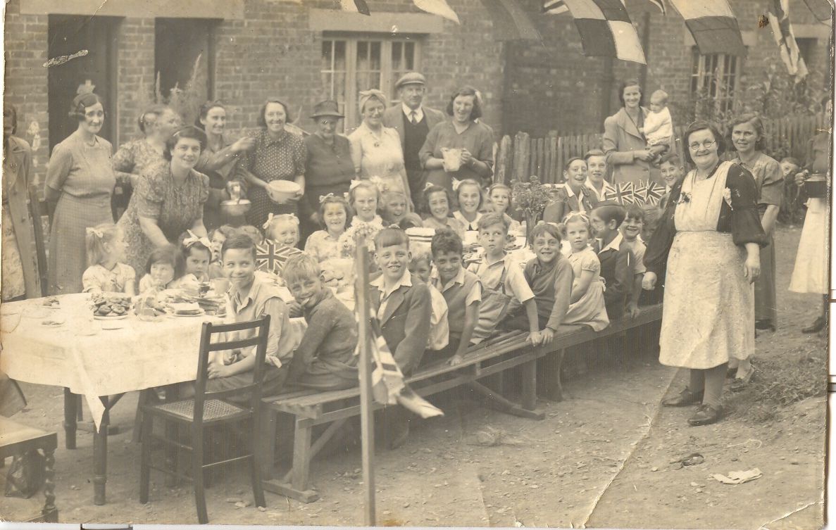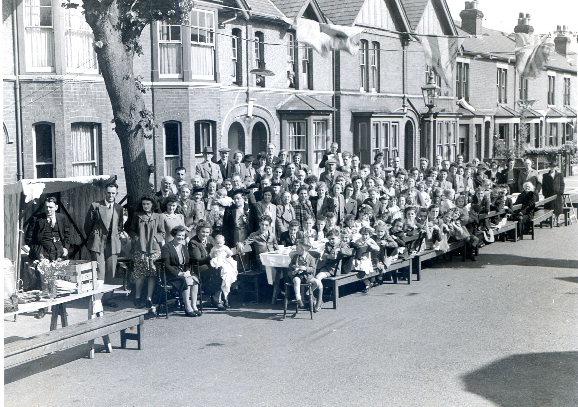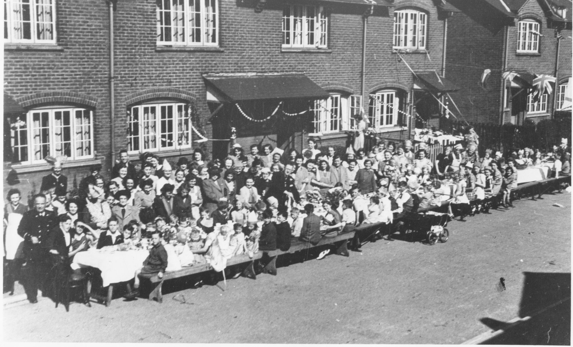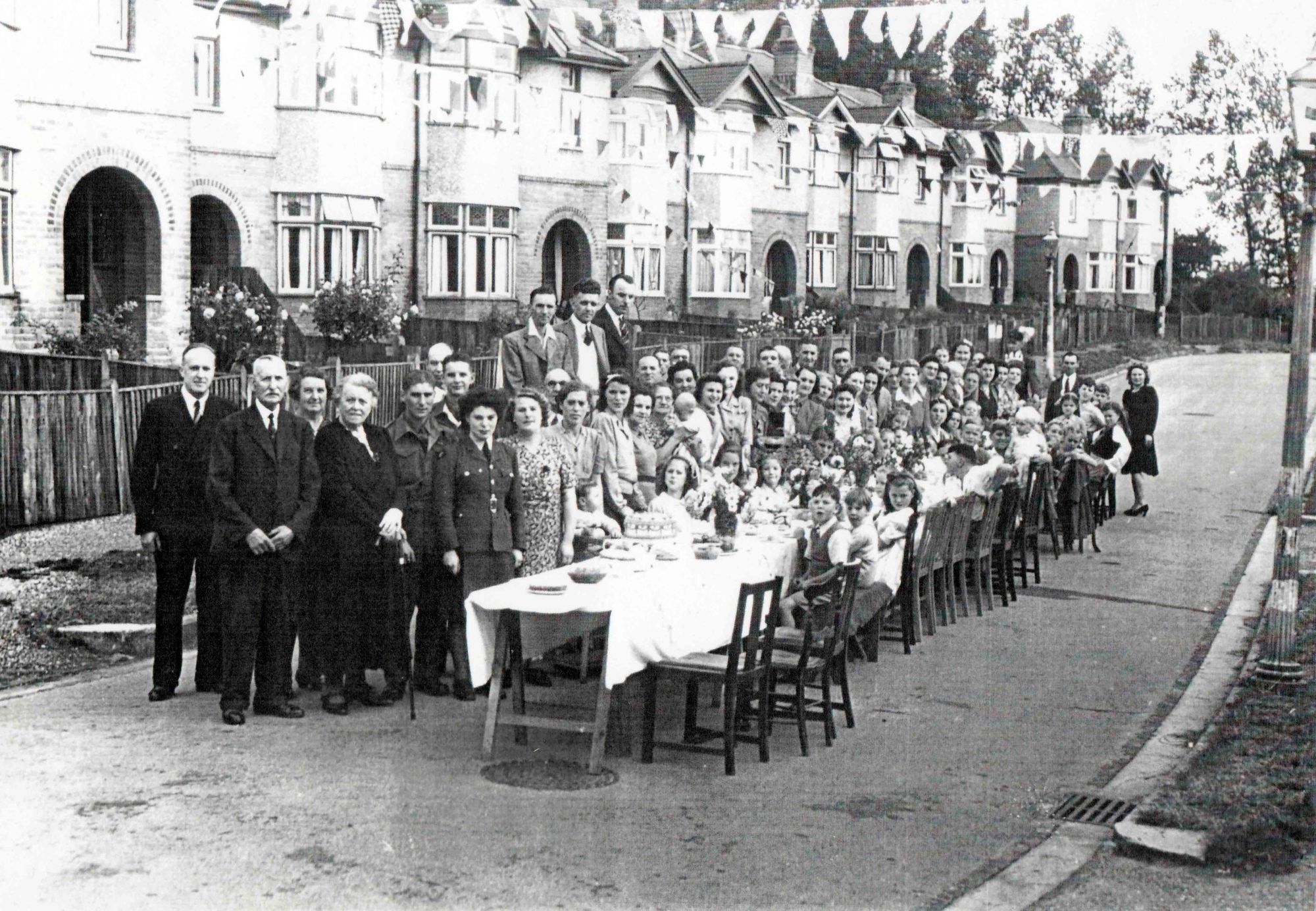 Photograph showing view looking west of a VE Day street party along Soper Grove, Basingstoke. (Image courtesy of Hampshire Cultural Trust)Street party along May Street, Basingstoke. (Image courtesy of Hampshire Cultural Trust)South west view of street party along May Street, Basingstoke. (Image courtesy of Hampshire Cultural Trust)