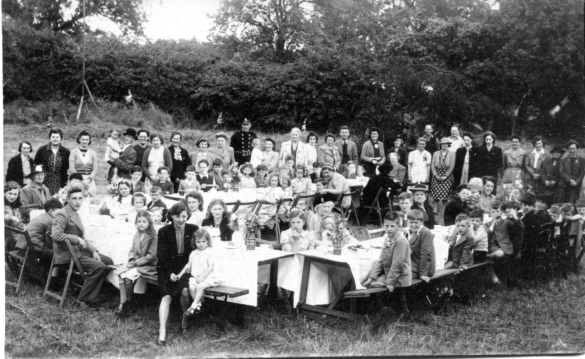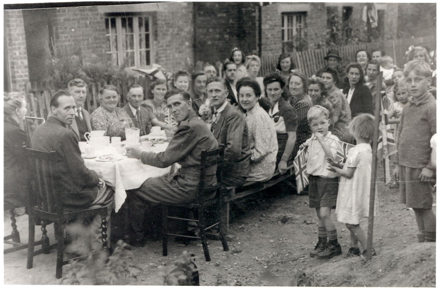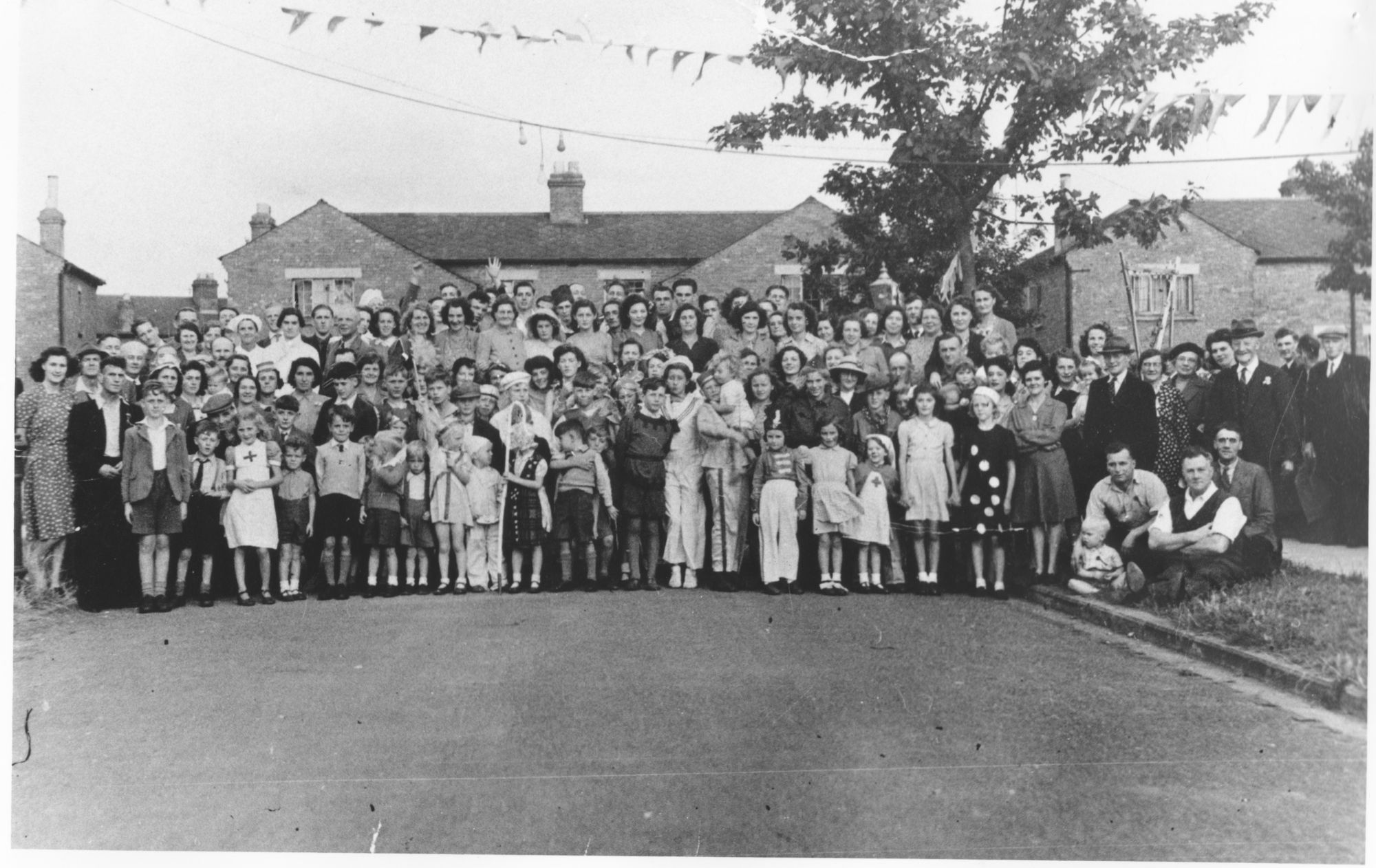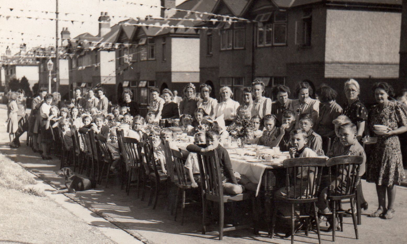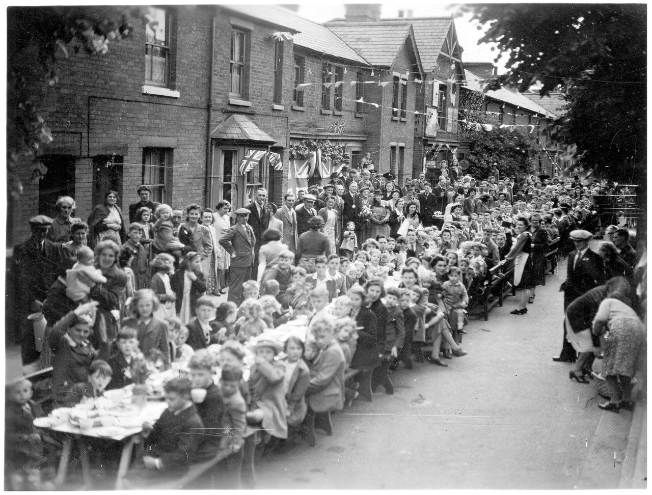 Photograph showing view looking west of a VE Day street party along Soper Grove, Basingstoke. (Image courtesy of Hampshire Cultural Trust)Street party along May Street, Basingstoke. (Image courtesy of Hampshire Cultural Trust)South west view of street party along May Street, Basingstoke. (Image courtesy of Hampshire Cultural Trust)