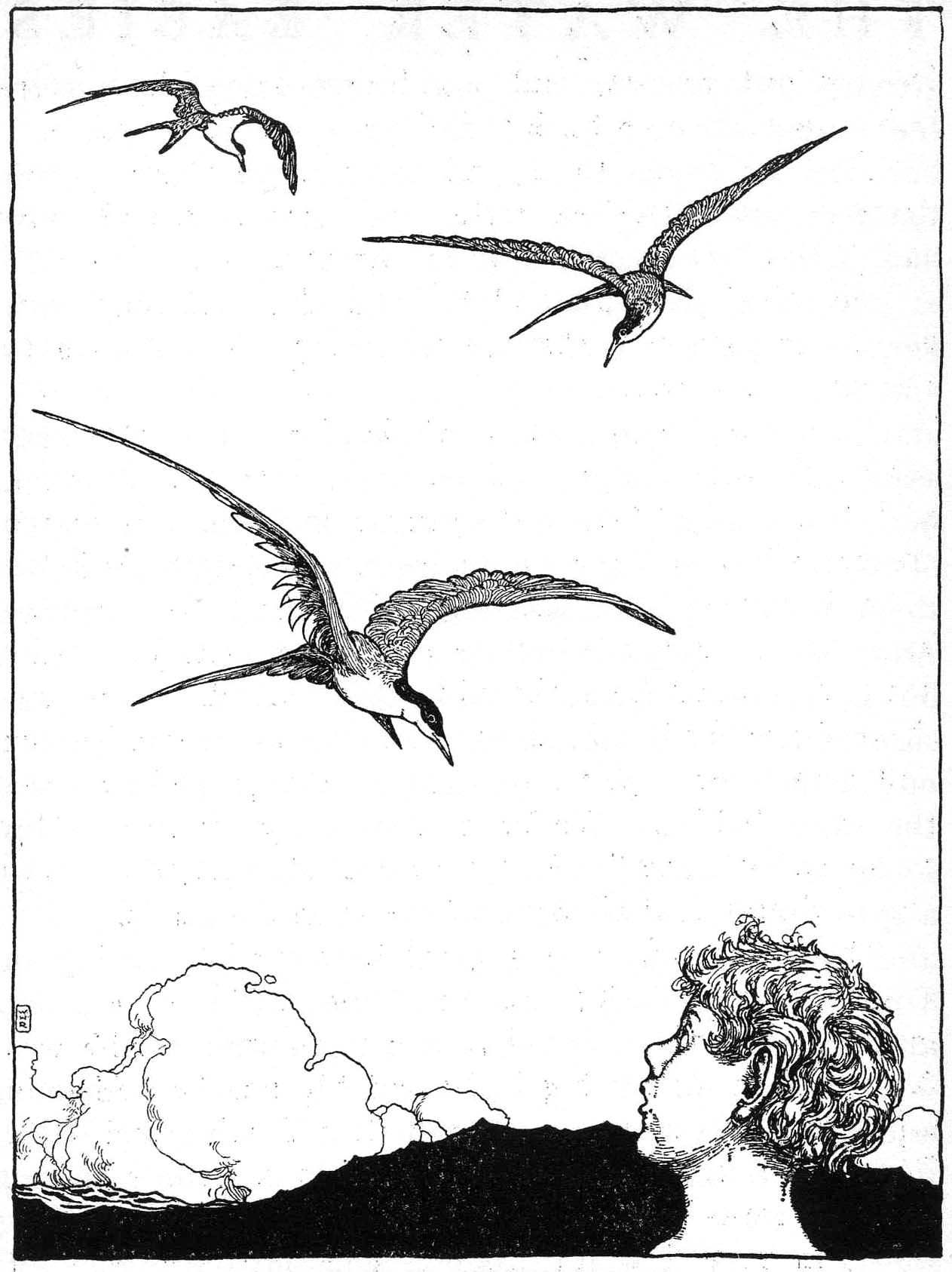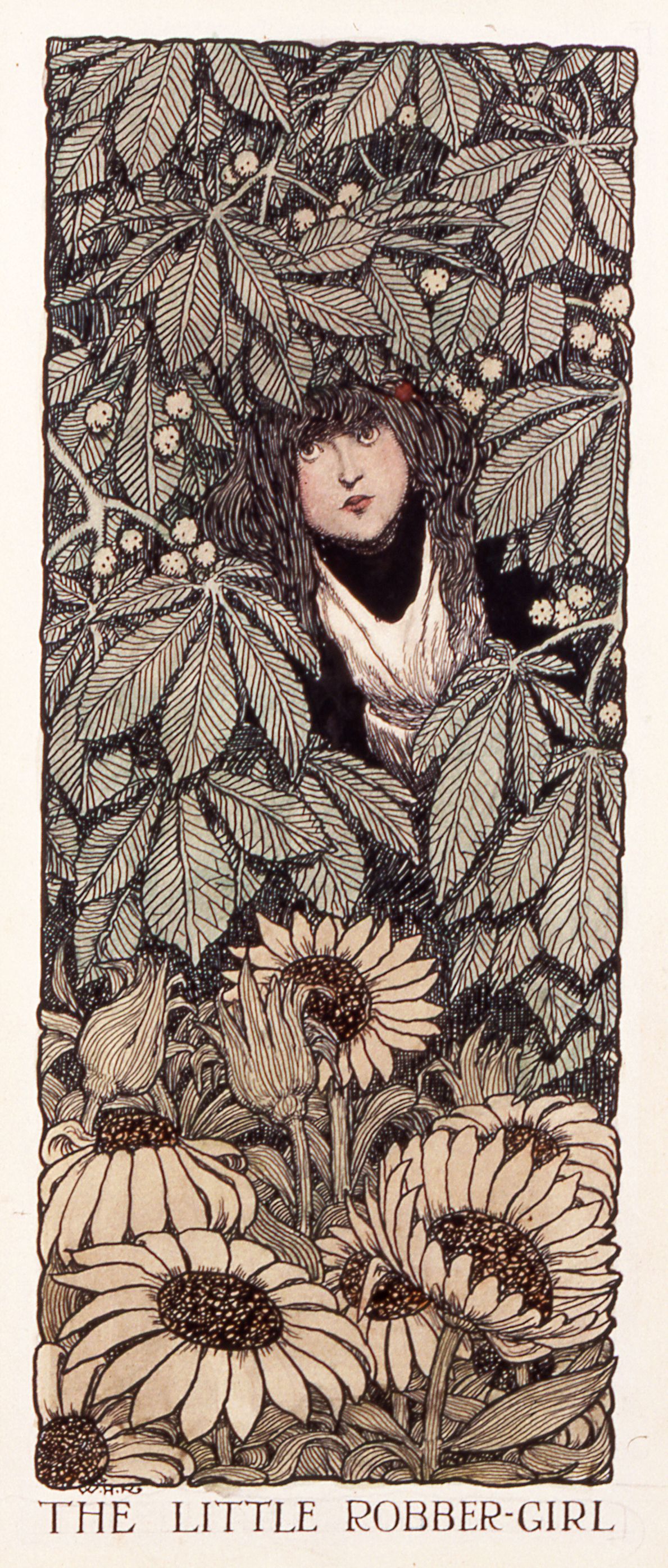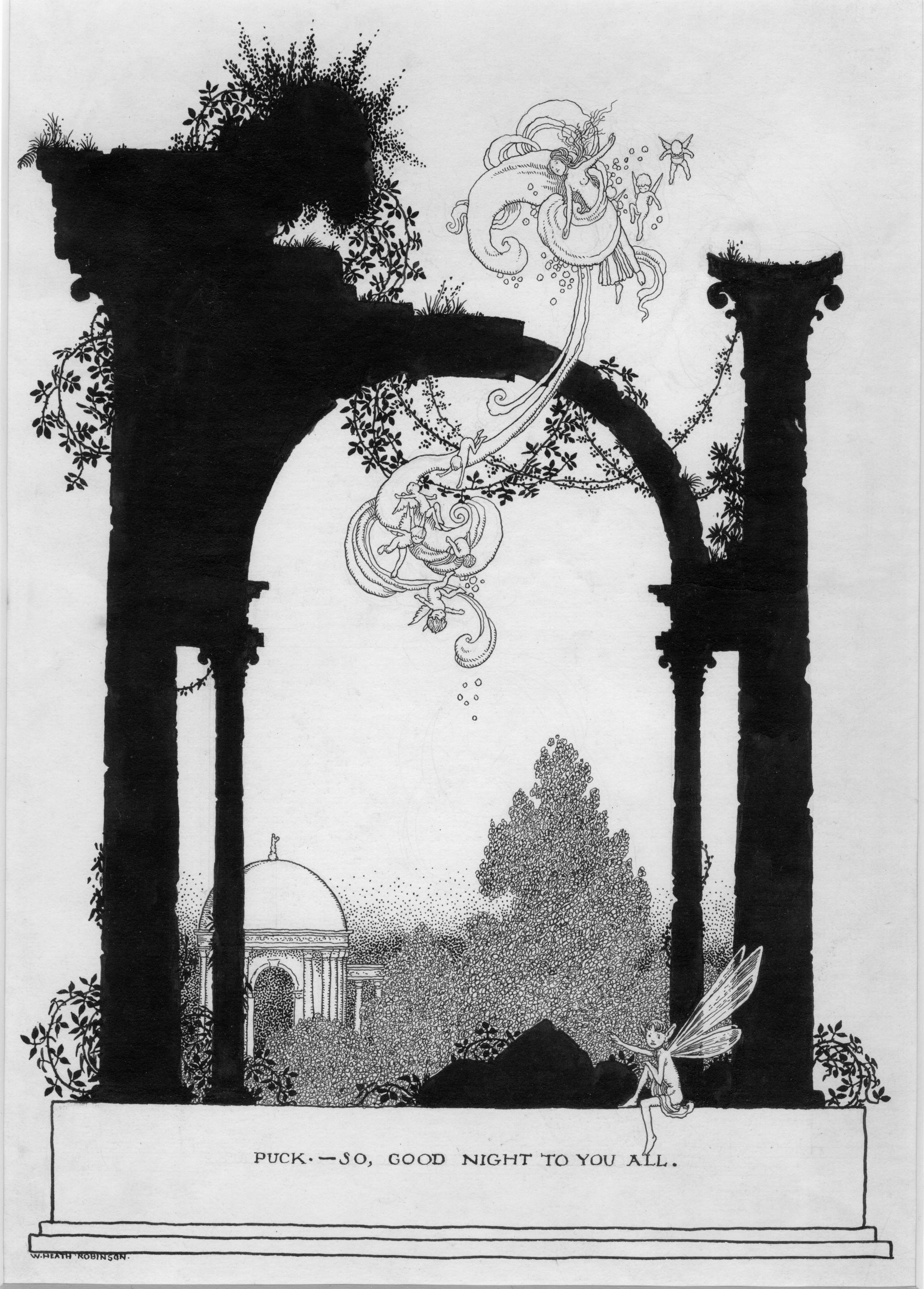 This period of Robinson’s career saw the age of the gift book, with its sumptuous binding and tipped-in coloured plates. His contributions to the genre not only included editions of Shakespeare’s plays, but also Kipling’s poetry and Hans Andersen’s and Perrault’s fairy tales. His black and white illustrations to A Midsummer Night’s Dream rank amongst the finest produced for any book in the 20th century. What is clear in every set of illustrations for each new publication is how attentively Robinson reflects the characters and context to convey each tale with distinctly individual consideration.