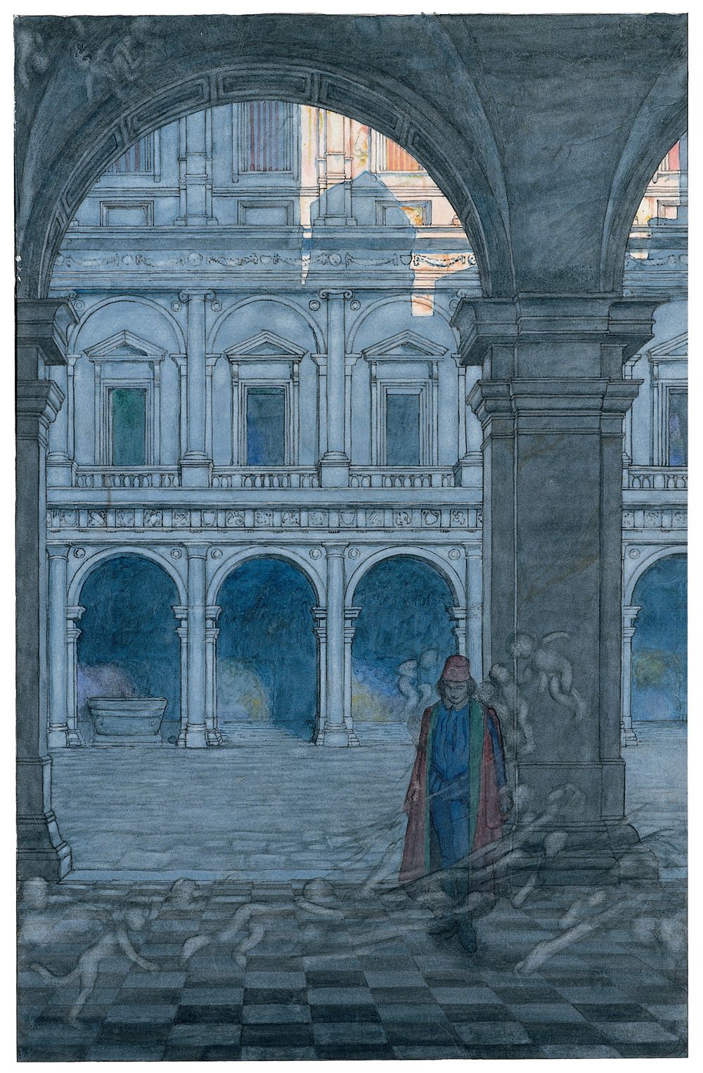 From 1906 to 1916, Heath Robinson successfully combined the careers of comic artist and serious illustrator, producing what was to be his best work in both fields. Robinson’s illustrations for Shakespeare’s Twelfth Night in 1908 demonstrate his ambition to convey the ambience of the play, rather than to provide a literal record of its action. Many of the illustrations retain a theatrical atmosphere, playing with light on the facades of renaissance buildings, or adopting a high viewpoint much as a theatre goer would experience seated in the upper circle. The soft colour palette and effects of light not only add drama to the scenes, but help to transport the viewer to the past at the time of the play’s setting.