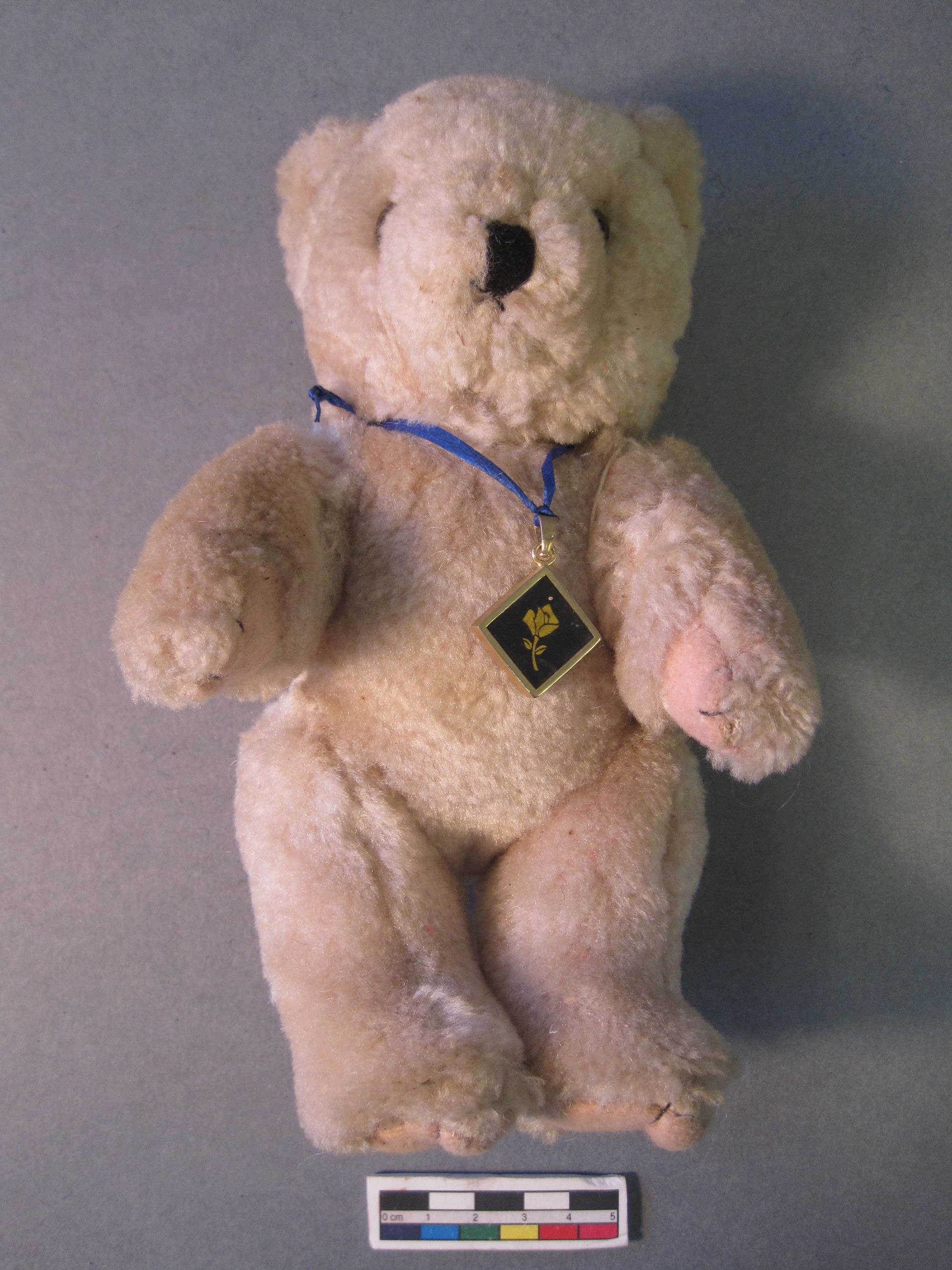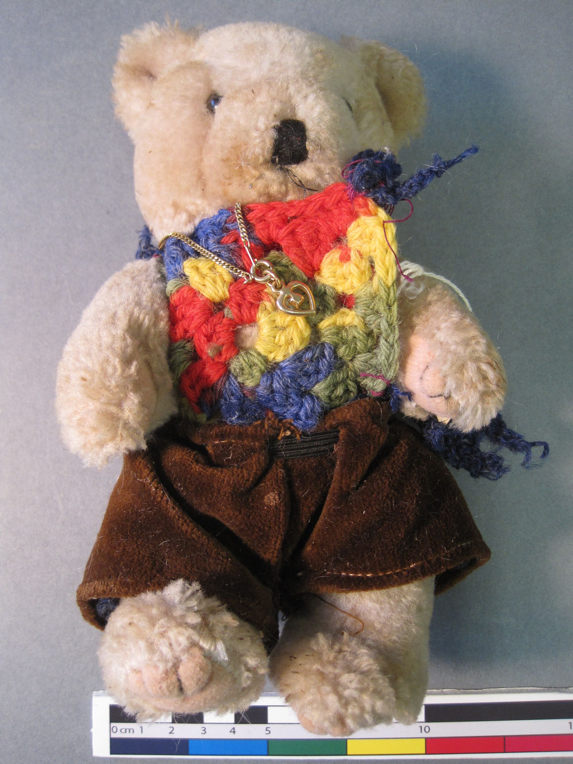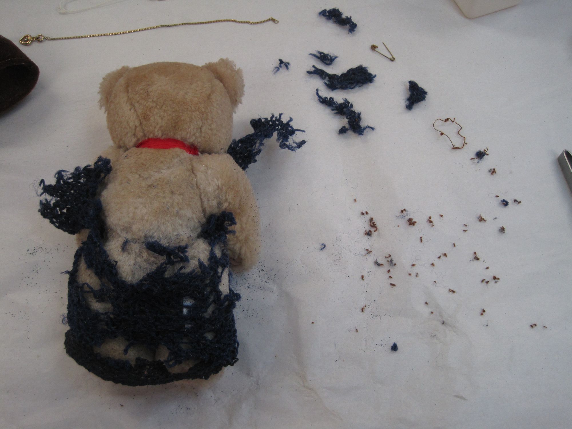 The bears arrived in the laboratory in a very sorry state. Before arriving at the museum, they had suffered from clothes moth, and although treated on arrival to prevent further moth attack (and so that we didn’t introduce any pests into our stores) the damage they had done was still clear. Moths love natural fibres, particularly wool, and they had munched straight through the woollen parts of Noel’s jumper, leaving the colourful (synthetic) crochet panel untouched.