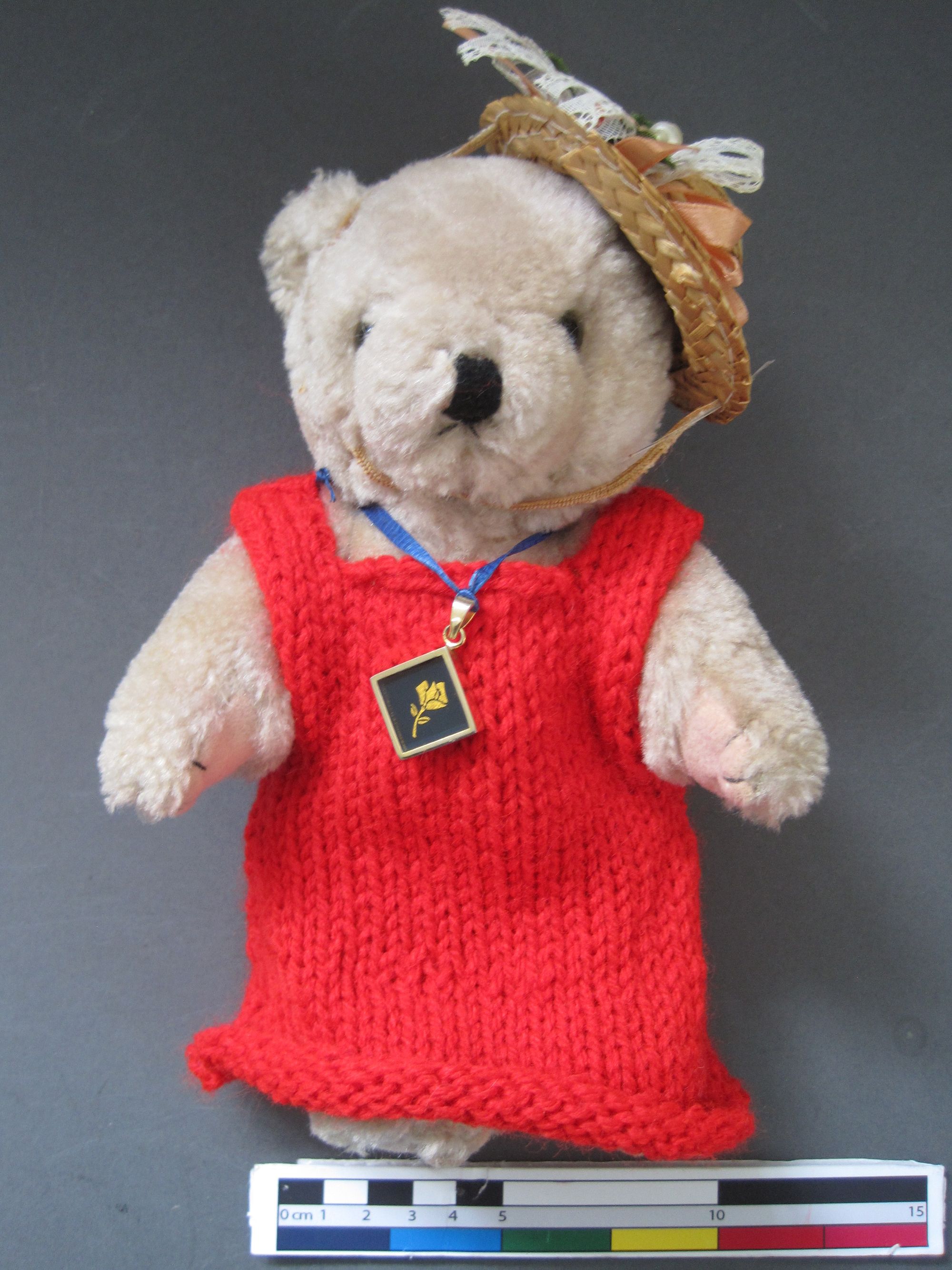 Luckily, Mr Simpson didn’t just leave his bears to us, but a stack of photo albums, and with a bit of searching an image of the (fully clothed!) bears was found. Noel’s jumper was sleeveless, and Noeletta’s dress a red knitted shift dress. What looked like a red ribbon around her neck had completely disappeared.