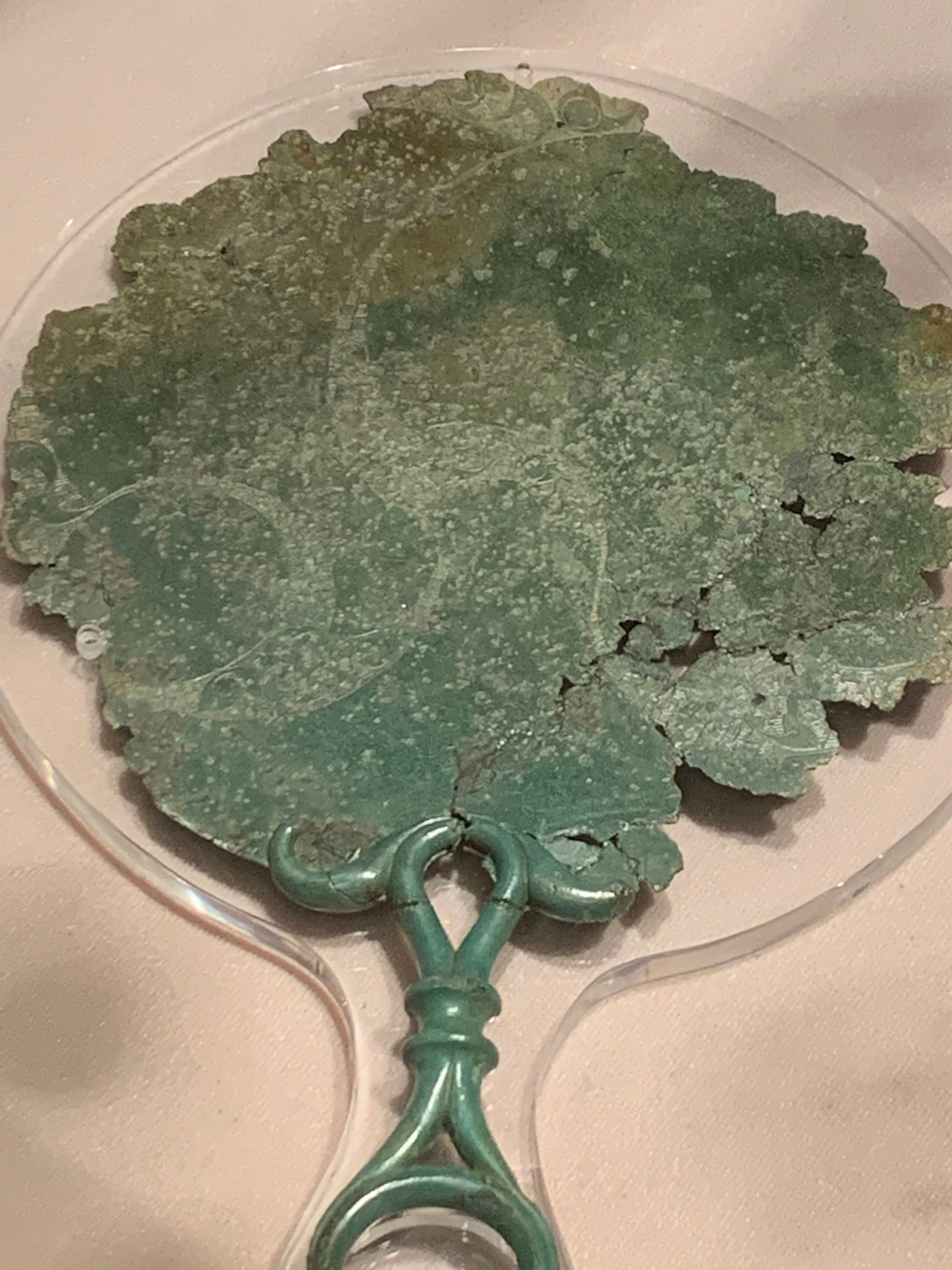One of the really intriguing objects in our collection is the Hampshire Mirror. Fragments of this mirror were found by Mr David Walsh, whilst metal detecting just a few kilometres south of Silchester in North Hampshire.