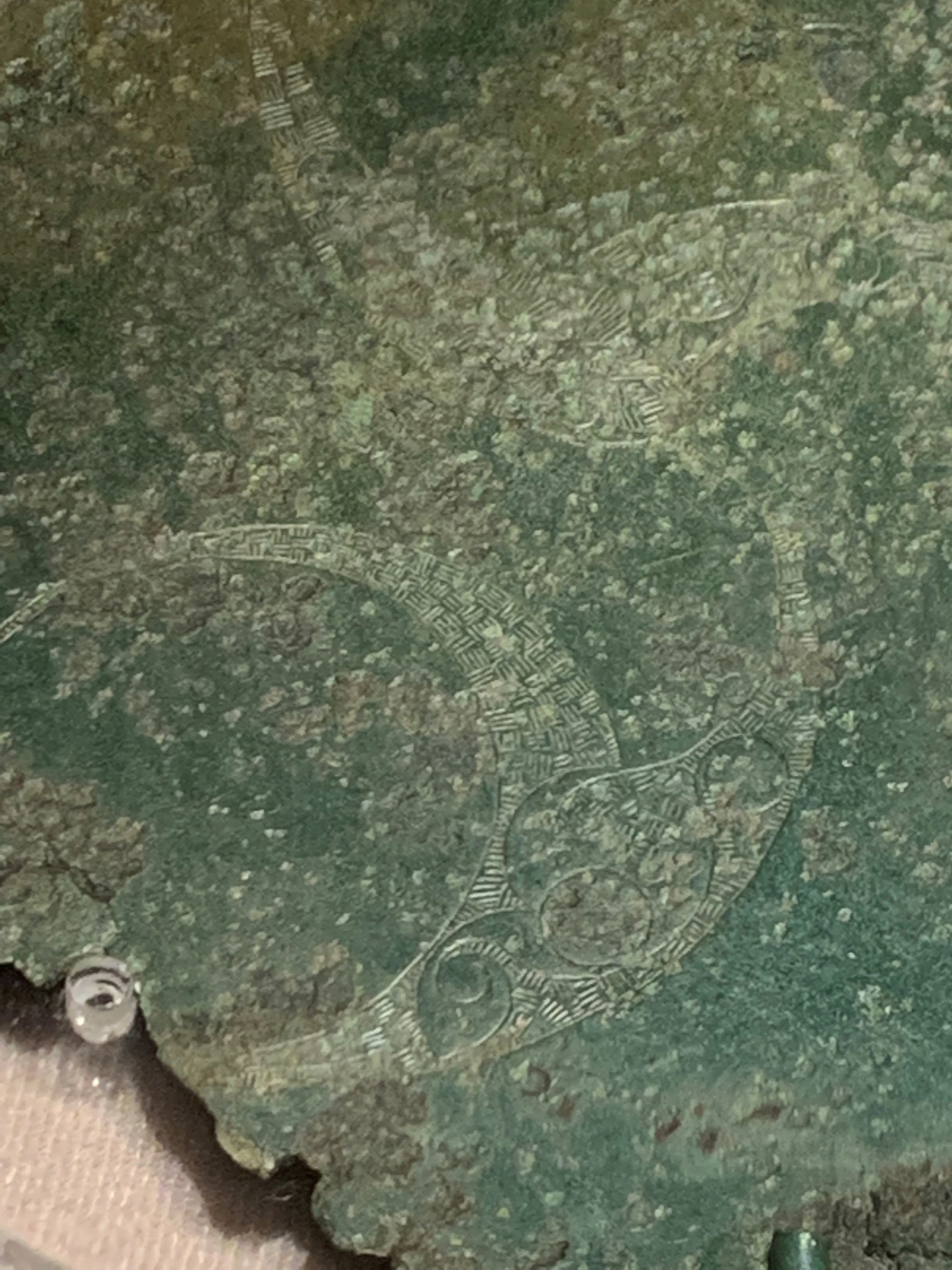 As you can see from our photograph (below) of the mirror on display at the museum, Celtic mirrors were usually highly decorated and considered important examples of Iron Age art, created from approximately 300 B.C. to 70 A.D. The mirrors are made of bronze, iron, or a combination of both, are believed to have been the possessions of high-born women and generally found within graves. The Celts had a hierarchical society, which means there was a chieftain, nobles, druids, craftsmen and farmers. The druids acted as teachers, priests and doctors. There was no written language so we tend to know about Celts from Romans such as Tacitus and Julius Caesar, who described life in Celtic society and also from what Greeks said about their Celtic neighbours.