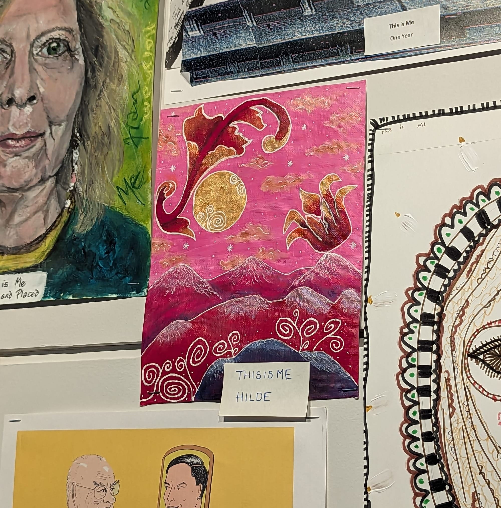 This is Me was the central theme of the exhibition and received the most submissions. This wall is full of self-portraits constructed in various witty ways that have been drawn, stitched and stuck.
