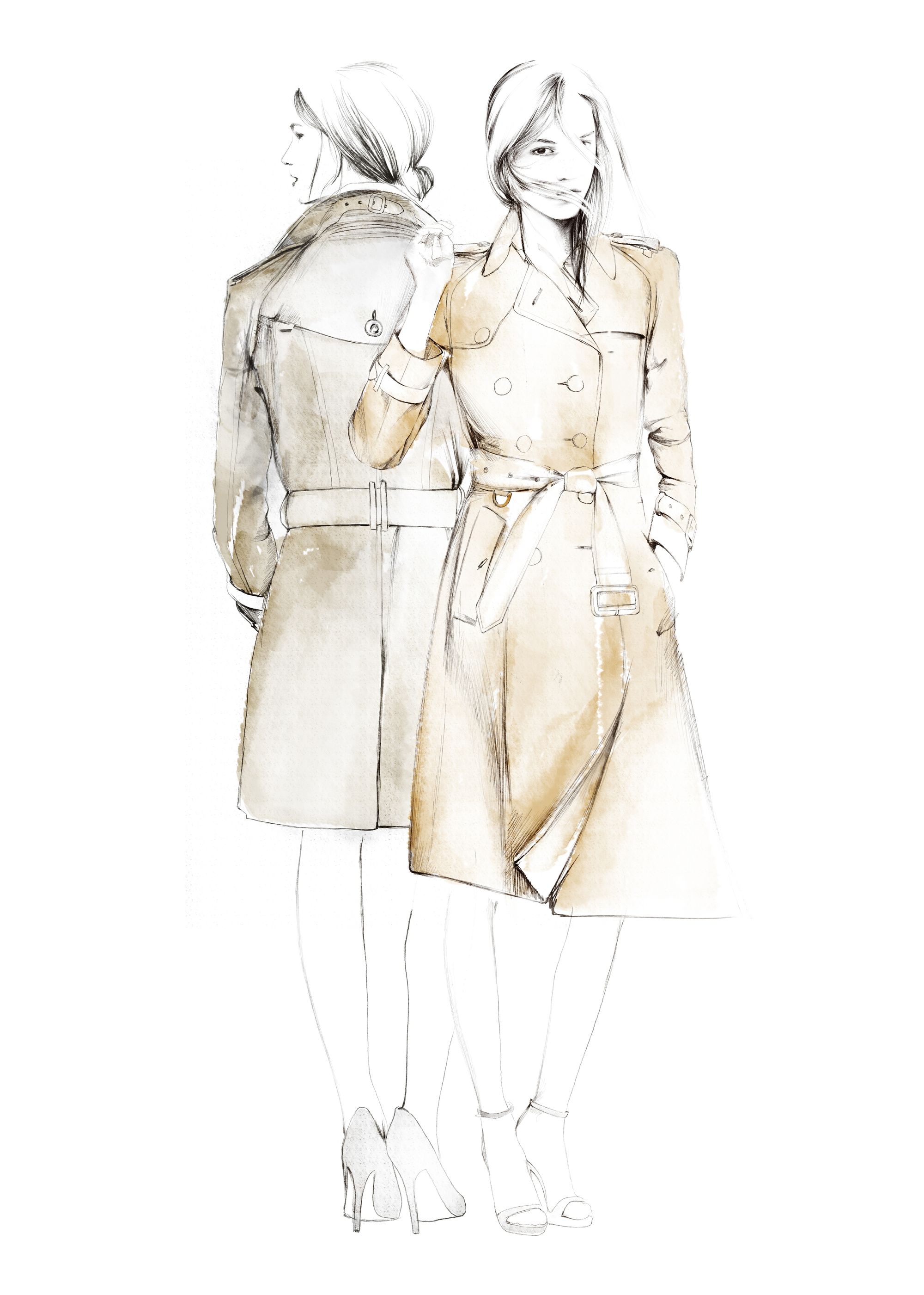 Leading international fashion illustrator, Spiros Halaris, created a beautiful opening graphic for the exhibition, detailing the most recognisable features of a trench coat – many having evolved from earlier military functionality.