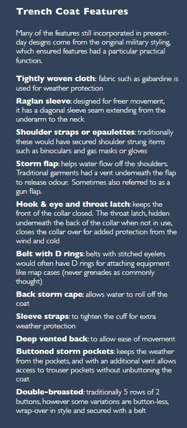 The story begins with the little-known fact that fashion house giant Burberry was founded in the 1850s, in Basingstoke, Hampshire. Inspired by fabric used to make shepherds' smocks, Thomas Burberry designed the water repellent cloth gabardine in 1879, which enabled individual fibres to be waterproofed, yet still breathable, in contrast to the earlier, rubberised technique of Macintosh. From there, the future of the trench coat was sealed.