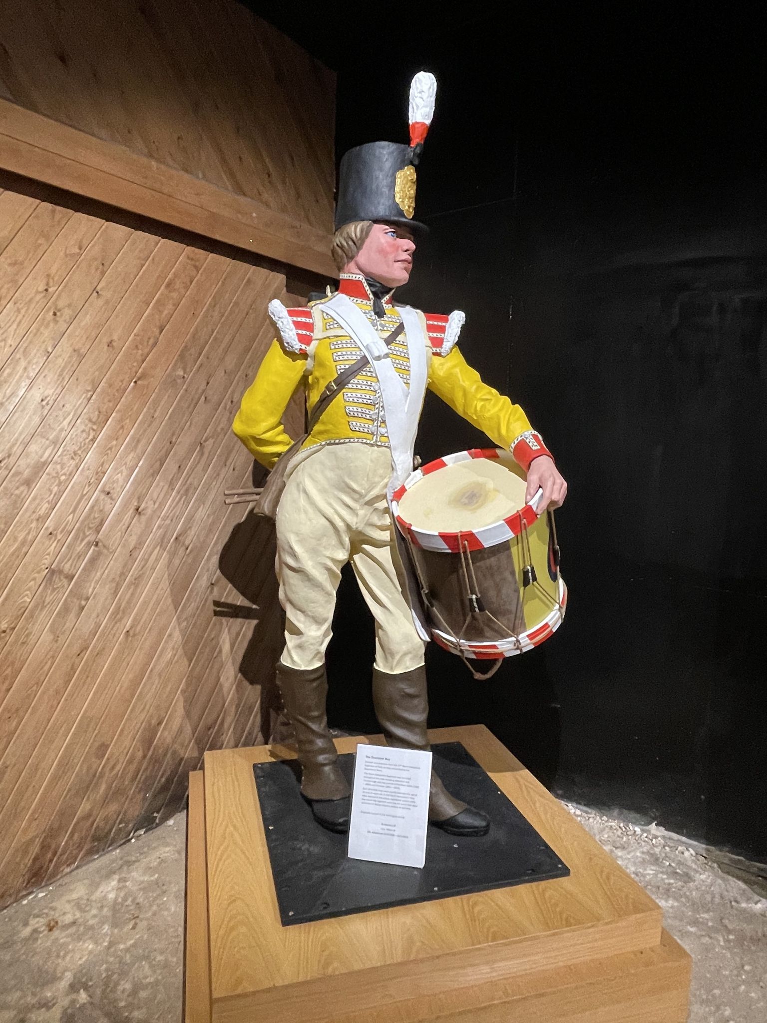 A not-so-little drummer boy stands in the corner of the local gallery at Aldershot Military Museum. Dressed as a drummer from the 37thNorth Hampshire Regiment of foot as they served during the Napoleonic wars. Such drummer boys were usually between the age of 12 and 16 years old. In the North Hampshire regiment drummer boys were dressed in yellow regimental colours while the rest of the regiment wore red tunics, common for British infantry soldiers at the time.